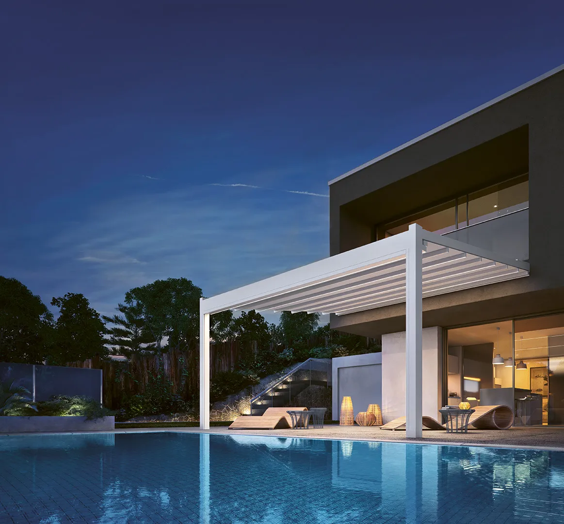 Die geneigte Pergola schafft fließende Übergänge zwischen Innen- und Außenbereich – mit klaren Linien und beweglicher PVC-Überdachung.